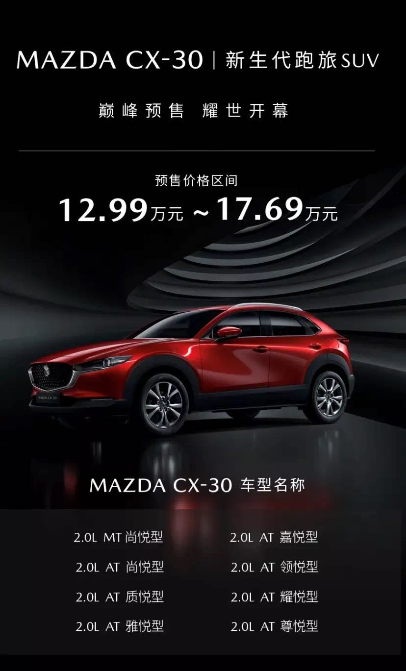 4月26日「新生代跑旅SUV」MAZDA CX-30開(kāi)啟預售,跨界風(fēng)格濃郁,耀世開(kāi)幕。
