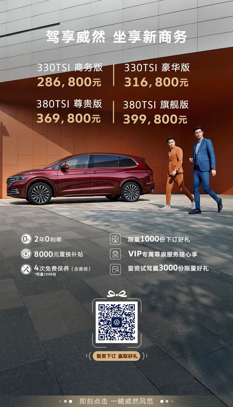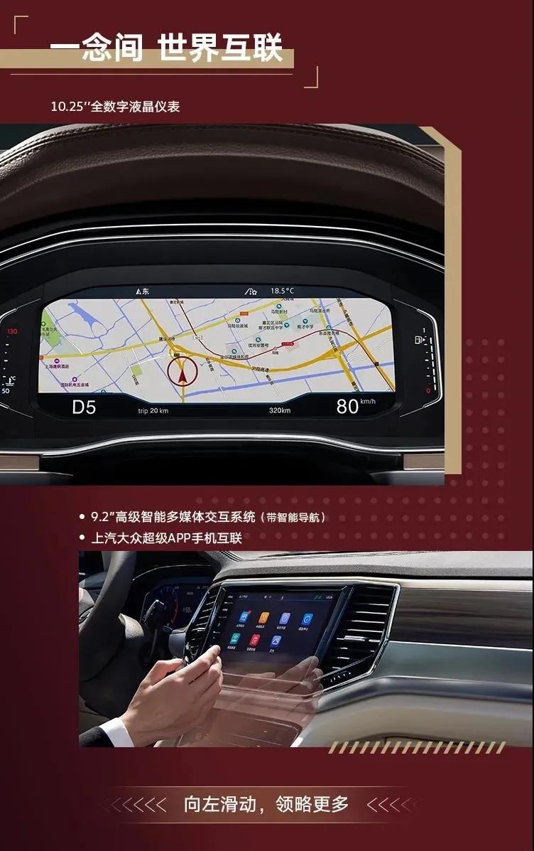 內飾沿用了大眾家族化設計,各功能區規劃整潔簡(jiǎn)約。Nappa高級皮質(zhì)包覆方向盤(pán)配有鍍鉻裝飾,9.2英寸Glass Design全玻璃觸控面板和10.2英寸全數字化液晶儀表智能高端。Captain chair行政級奢享第二排座椅,集零重力電動(dòng)調節、主動(dòng)通風(fēng)功能、加熱功能及按摩功能于一身。再加智能雙側防夾電動(dòng)門(mén)和Panorama大尺寸全景天窗,時(shí)刻悅享非凡!
